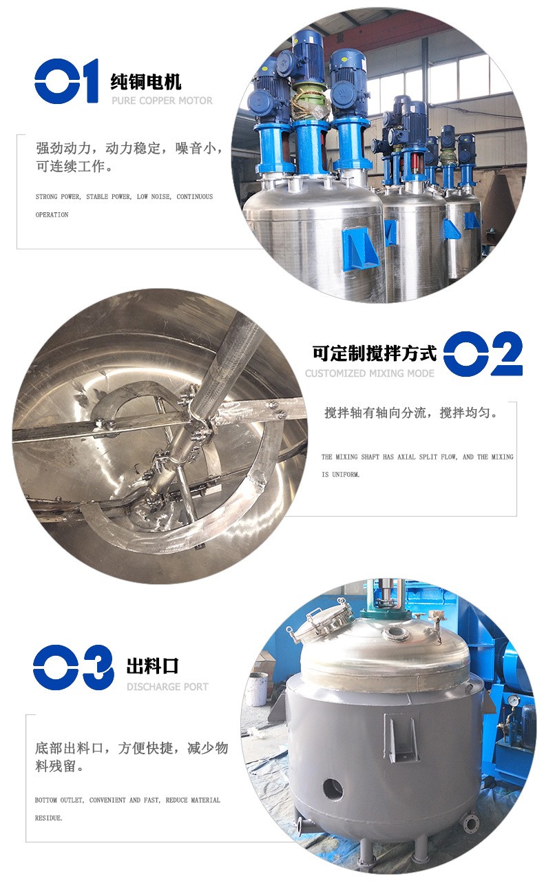 反應(yīng)釜由釜體、釜蓋、夾套、攪拌器、傳動(dòng)裝置、軸封裝置、支承等組成。攪拌裝置在高徑比較大時(shí),可用多層攪拌槳葉,也可根據(jù)用戶的要求任意選配。釜壁外設(shè)置夾套,或在器內(nèi)設(shè)置換熱面,也可通過外循環(huán)進(jìn)行換熱。支承座有支承式或耳式支座等。轉(zhuǎn)速超過160轉(zhuǎn)以上宜使用齒輪減速機(jī).開孔數(shù)量、規(guī)格或其它要求可根據(jù)用戶要求設(shè)計(jì)、制作。
